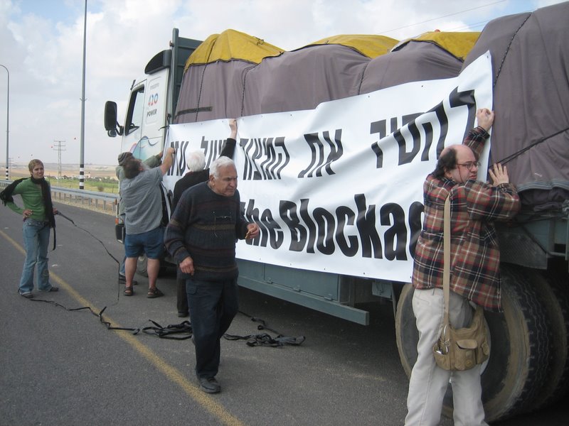 Yaacov Manor, one of the organizers of the action, supervises the hanging of the political slogan on the supplies