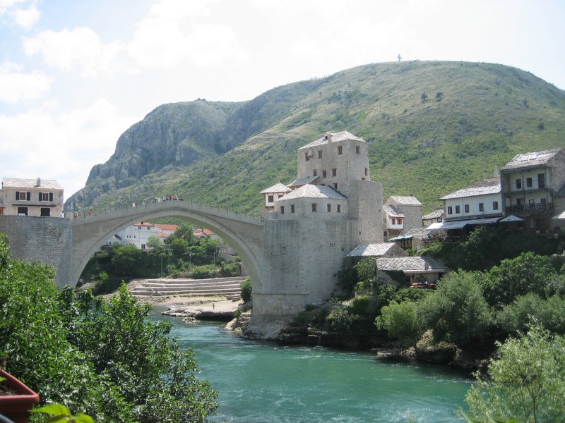 The restored historic bridge of Mostar. The original 400-years old bridge was destroyed by the Croats.