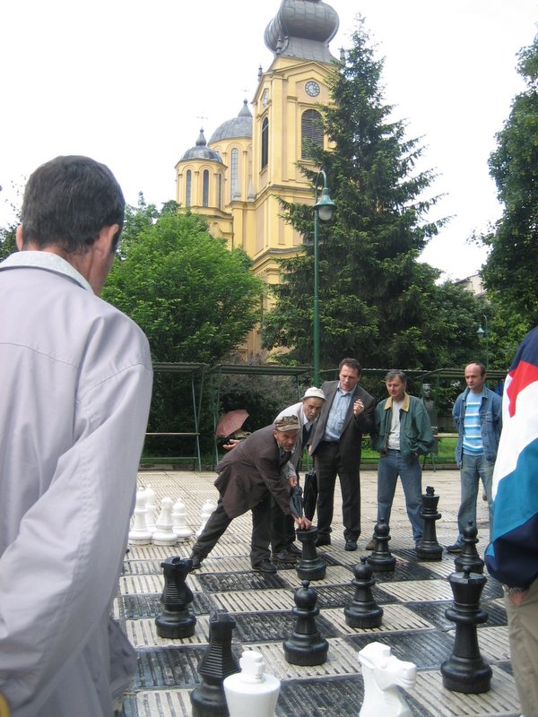 A picture of tolerance: Muslim inhabitants play chess near the Orthodox (Serb) church in the center of Sarayevo. Nearby are a mosque, a Catholic (Croat) church and a synagogue.